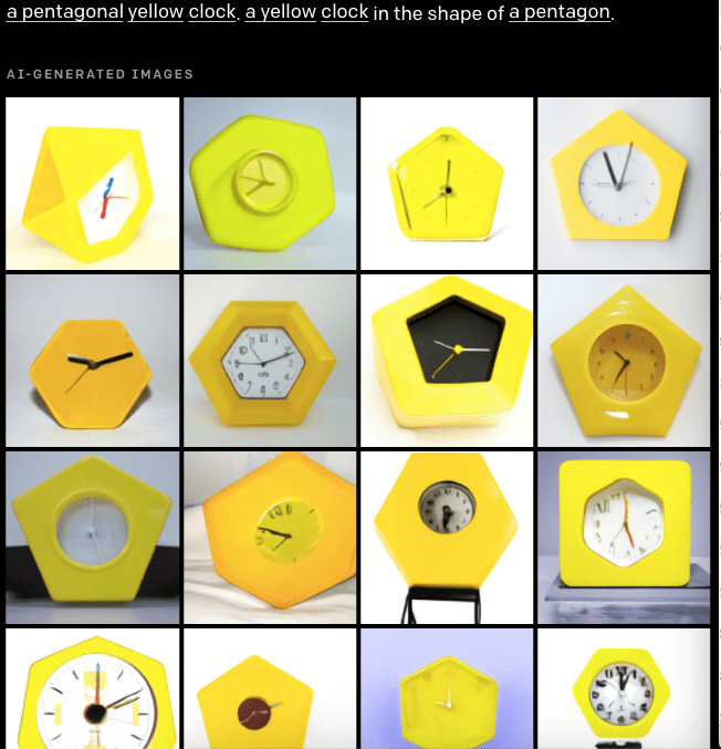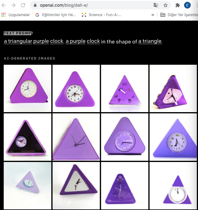 Bence sayfaya bir grip sizde deneyin ben çok eğlendim. Fikrinizi her değiştirdiğiniz bir ayrıntıda farklı seçenekler sunuyor bize. Örneğin ilk örnekte ben üçgen ve mor renkli bir saat istemiştim ama fikrimi değiştirdim diyelim. Altıgen ve sarı renkli bir saat istedim ve hemen Dall-E benim için seçenekleri değiştiriyor.