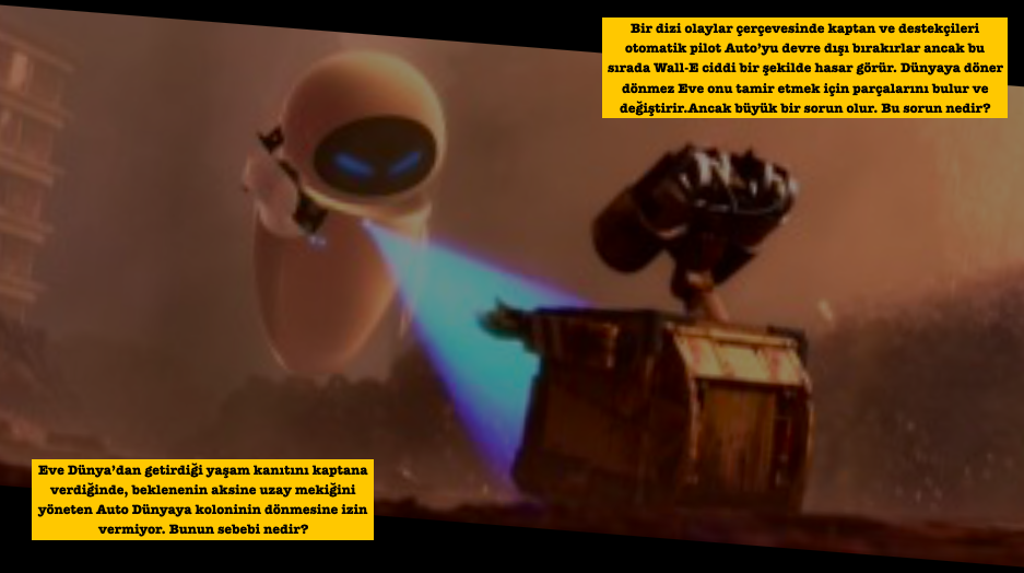 - Bir dizi olaylar çerçevesinde kaptan ve destekçileri otomatik pilot Auto’yu devre dışı bırakırlar ancak bu sırada Wall-E ciddi bir şekilde hasar görür. Dünyaya döner dönmez Eve onu tamir etmek için parçalarını bulur ve değiştirir. Ancak büyük bir sorun olur. Bu sorun nedir?